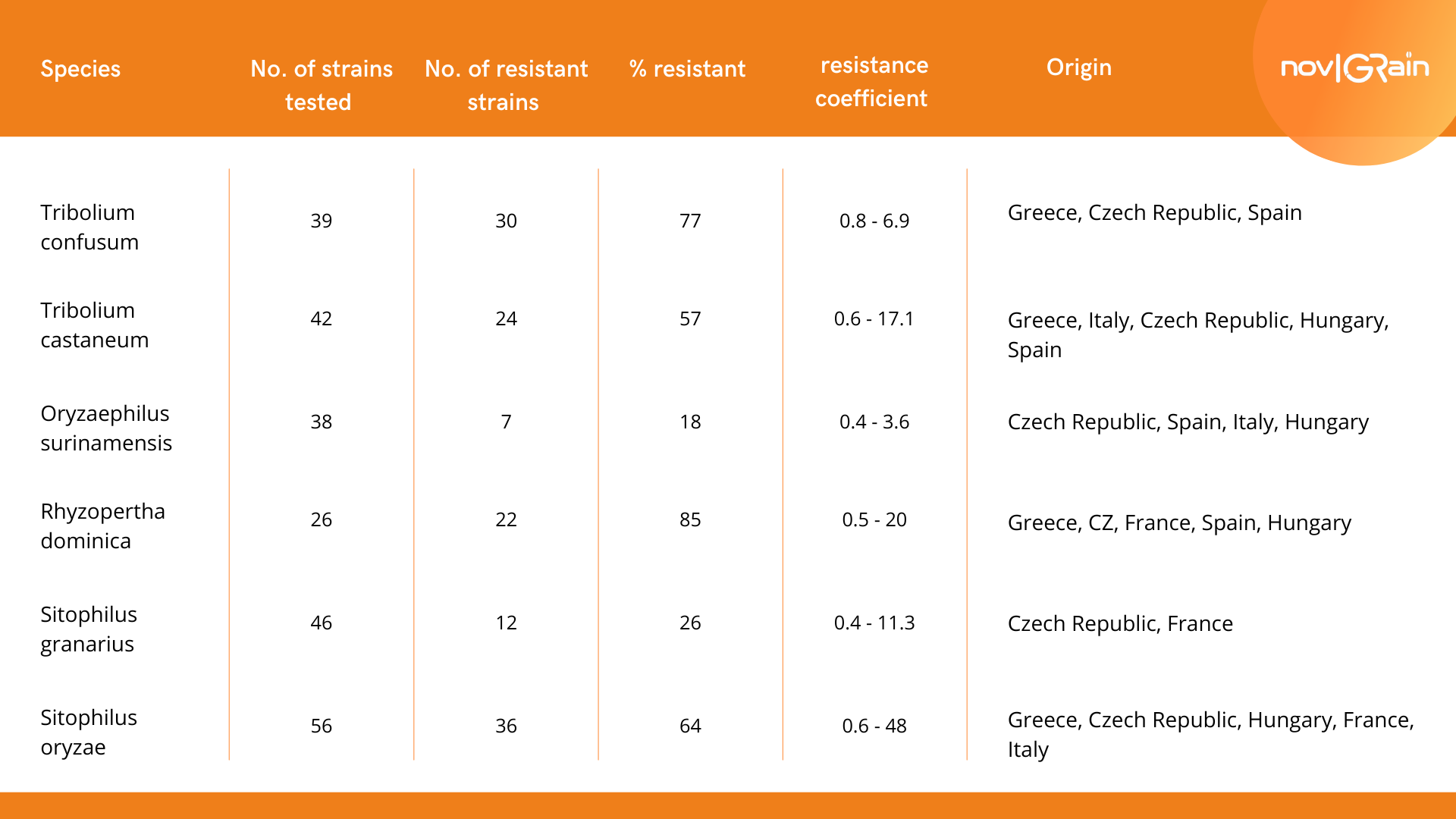 In the table below you can find the results of tests on phosphine resistance executed so far by CRI. The current results indicate significant differences in the frequency (%) and range of resistance to phosphine among the tested species and populations. The highest resistance was recorded in Rhyzopertha dominica; resistance was observed in 85% out of the collected and tested 26 strains.